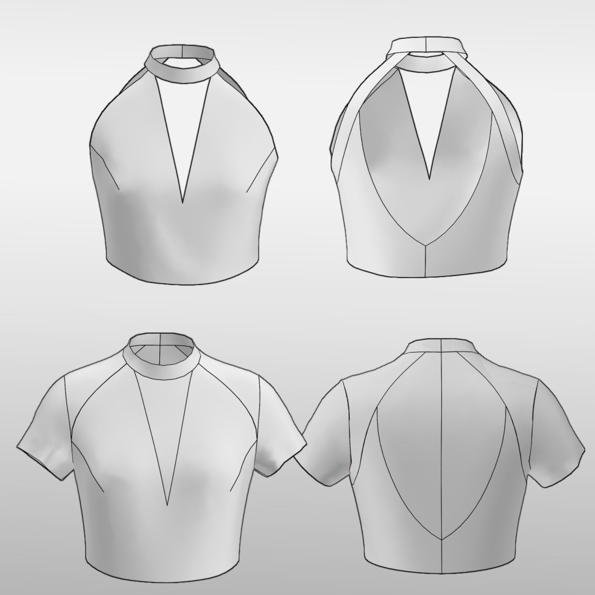 Oberteil 2: Schulterfrei mit spitzen Ausschnitt im Vorderteil und tiefem, rundem Ausschnitt im Rücken.